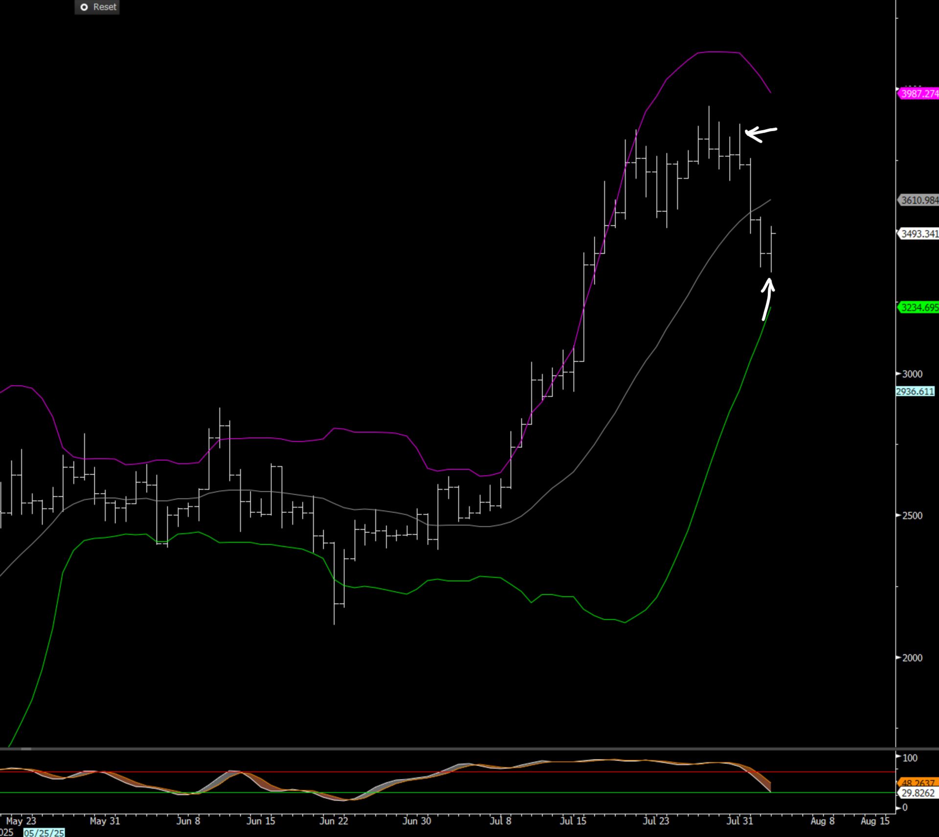 BTC: Finding support around 113k with the trendline and lower Bollinger band. Sunday's bullish engulfing could push it back to 120k, but a break below opens the door to 104k, then 98k.